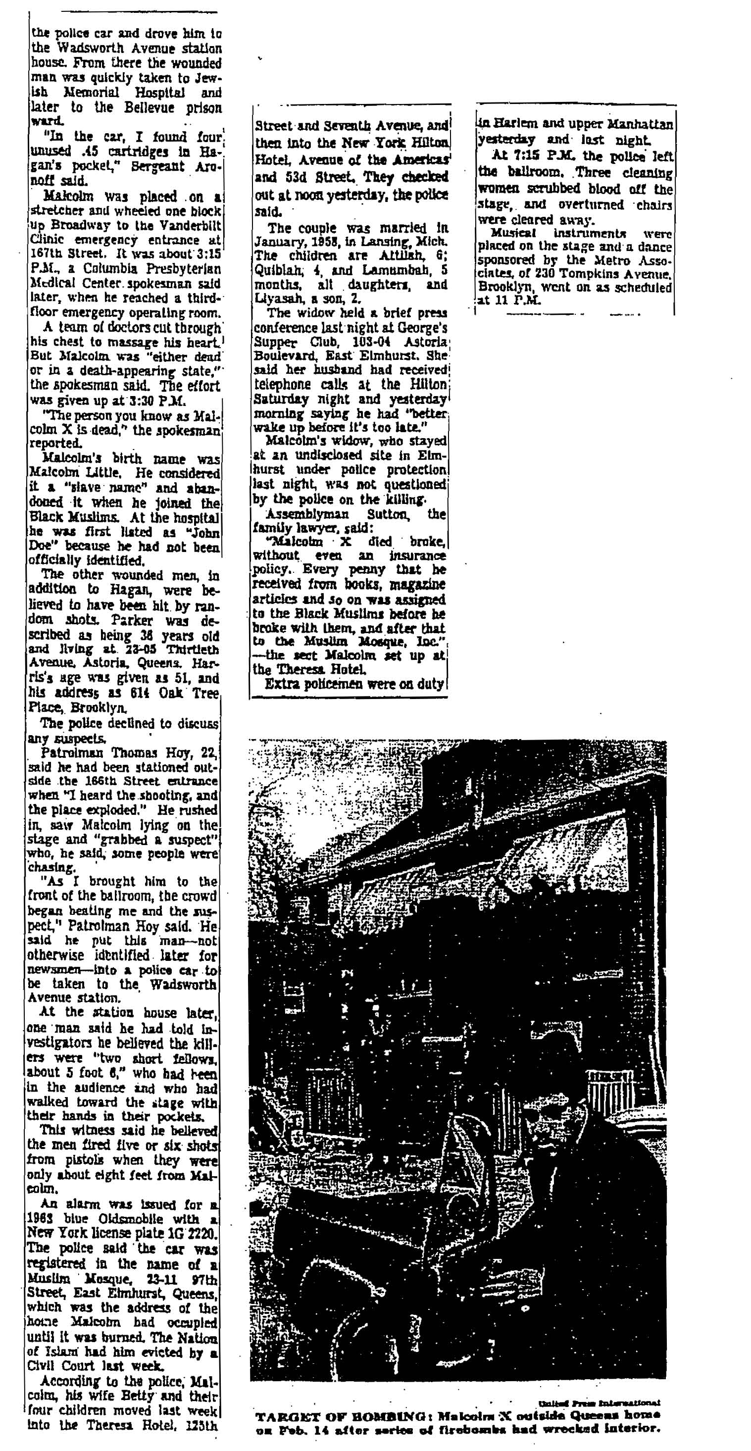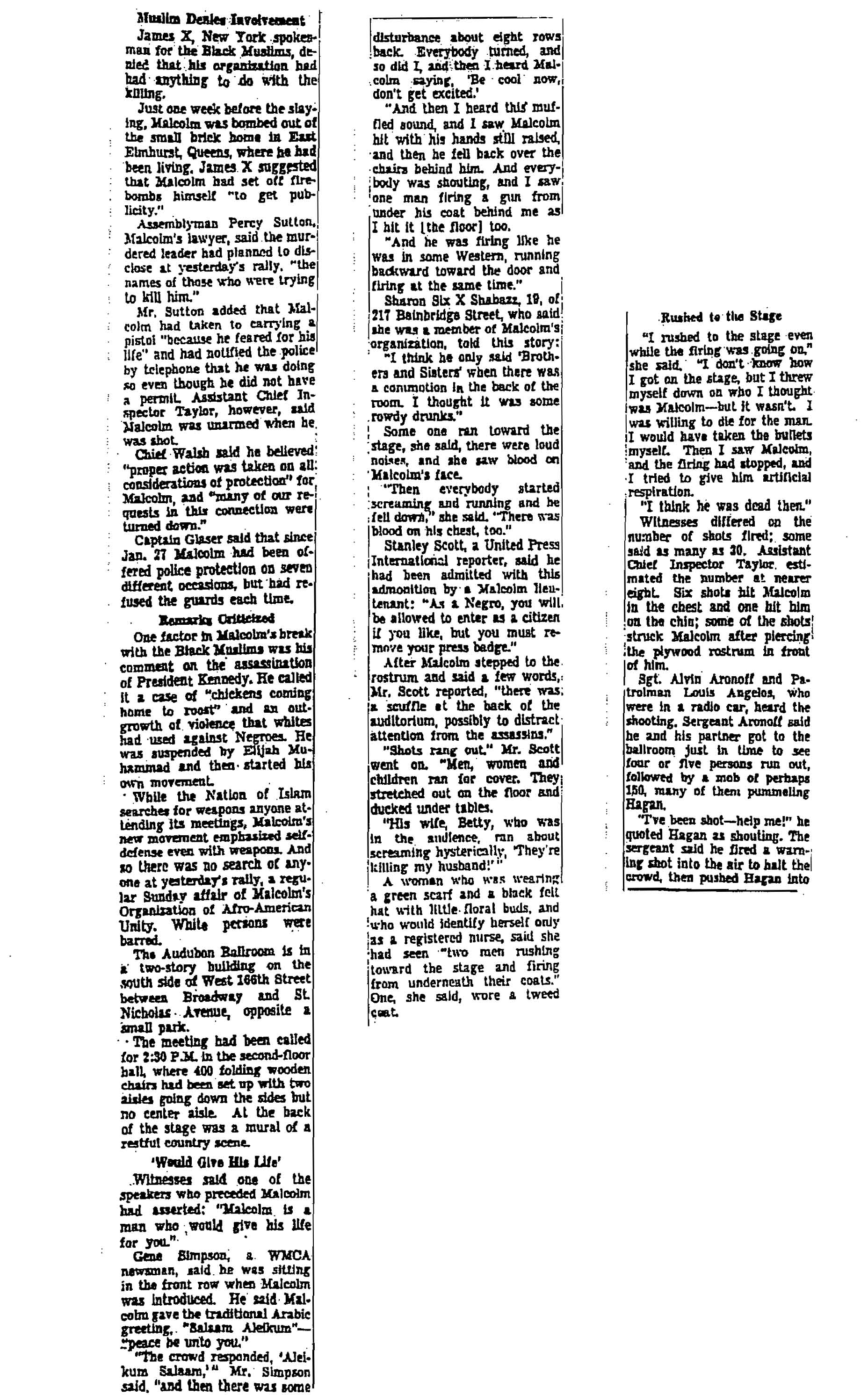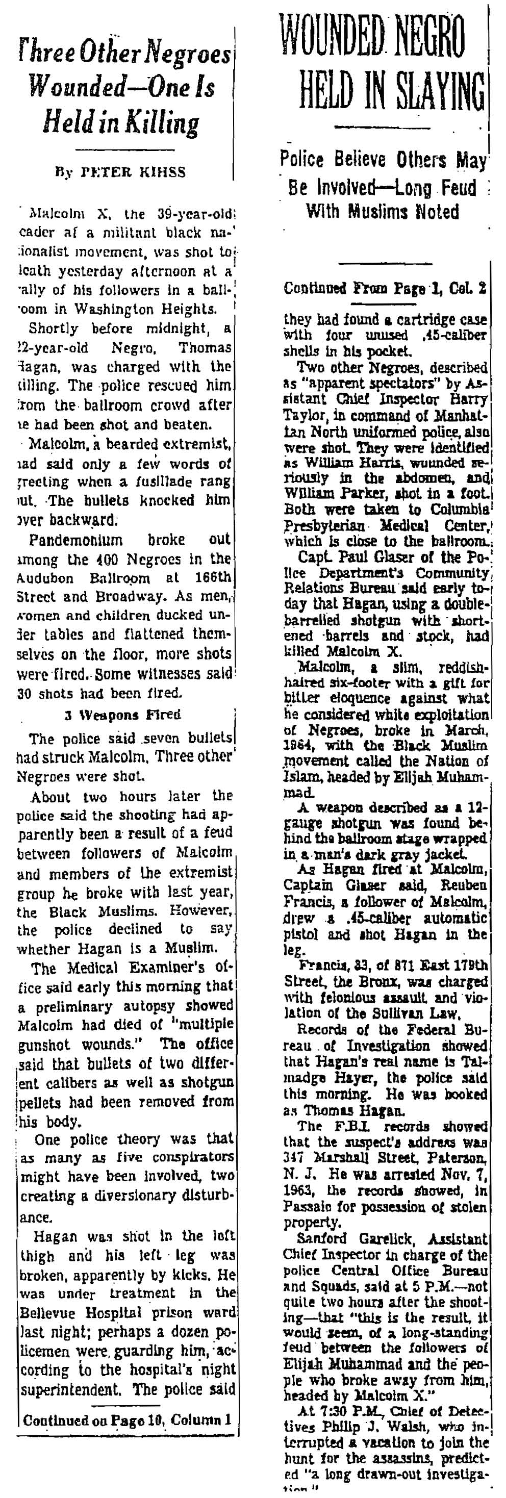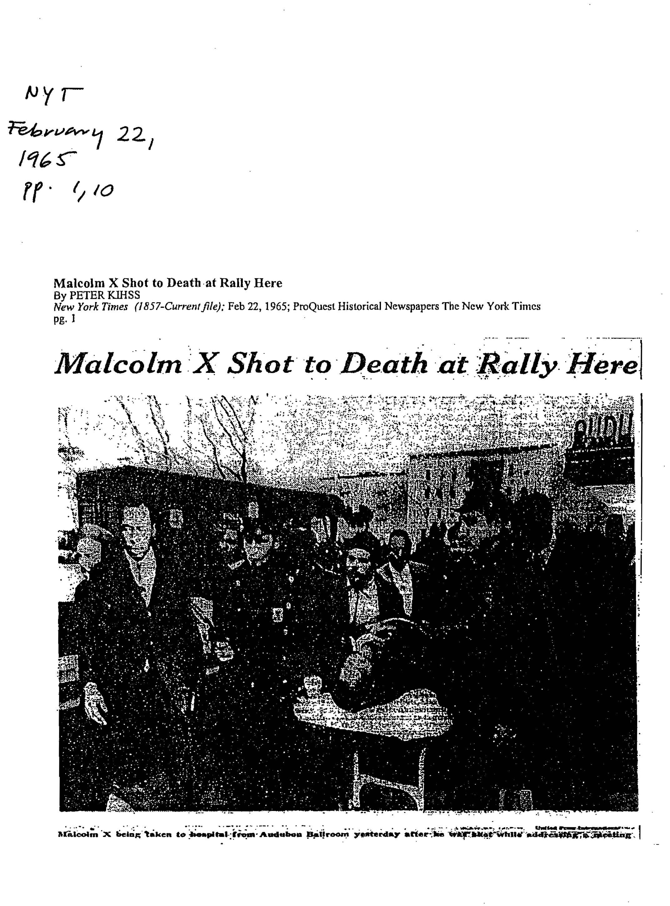 Kihiss, “Malcolm X Shot to Death at Rally Here,” New York Times, February 22, 1965, pp. 1, 10.