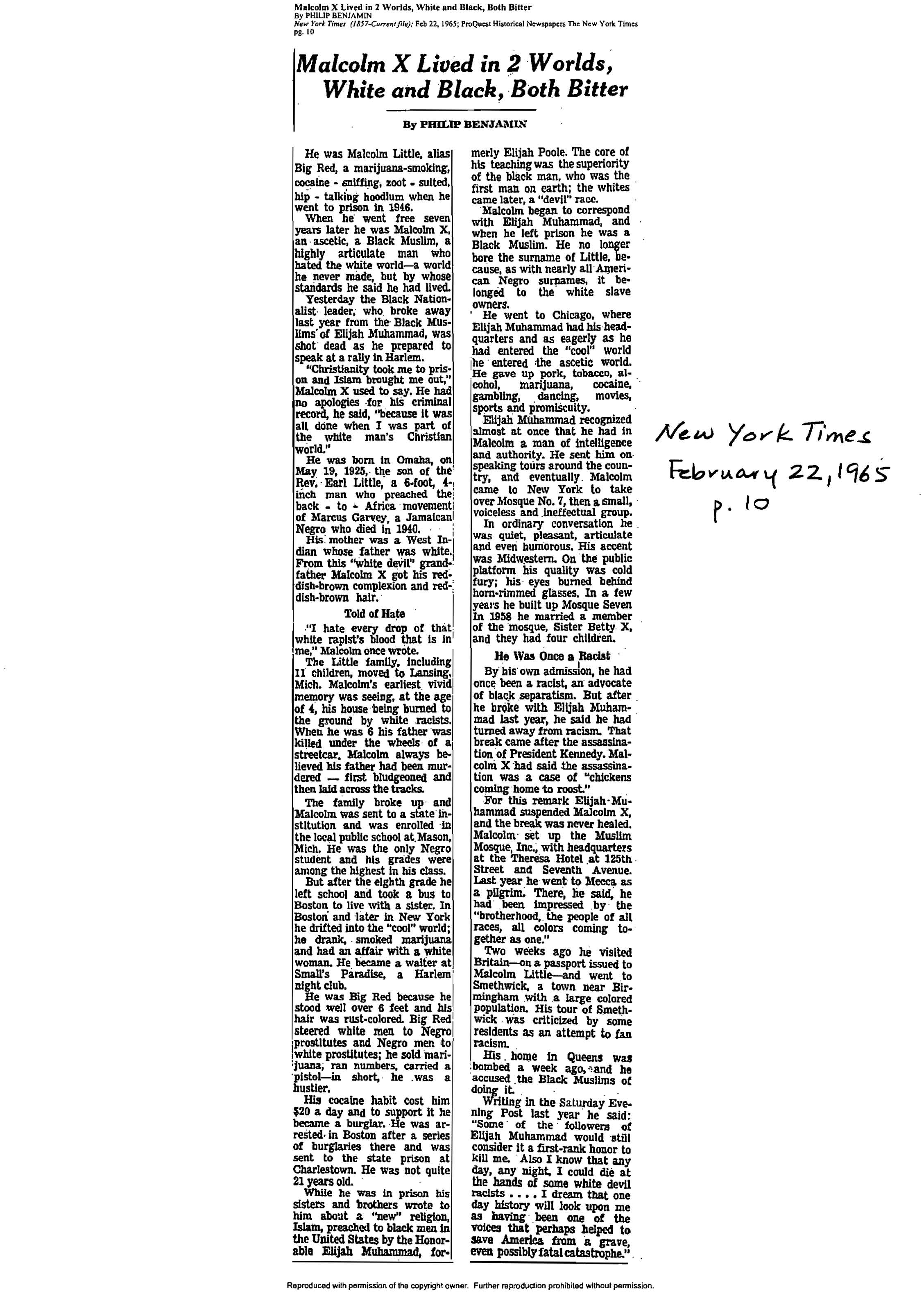 Benjamin, “Malcolm X Lived in 2 Worlds, White and Black, Both Bitter,” New York Times, February 22, 1965, p. 10.