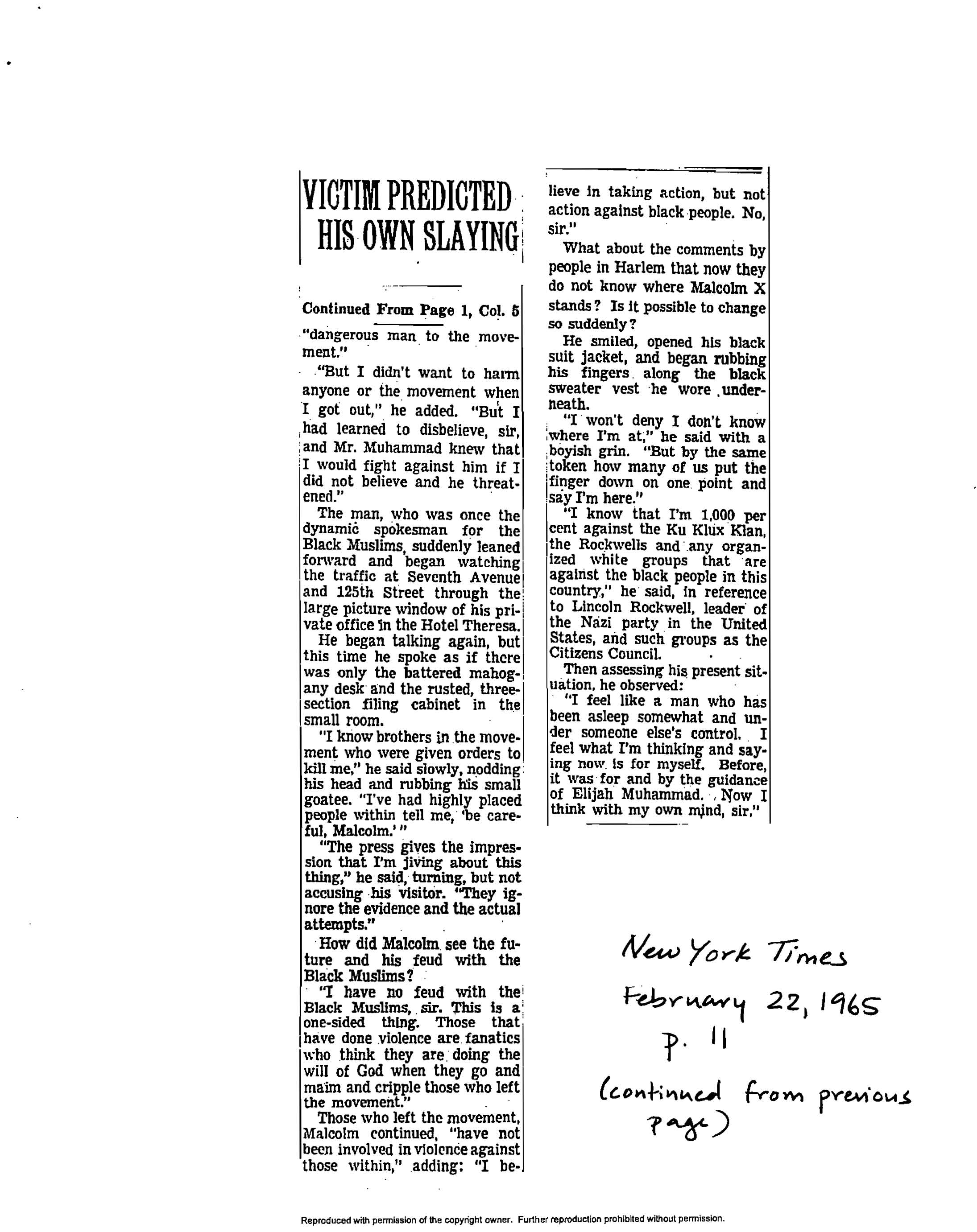 Lissner, “Malcolm Fought for Top Power in Muslim Movement and Lost,” New York Times, February 22, 1965, p. 11.