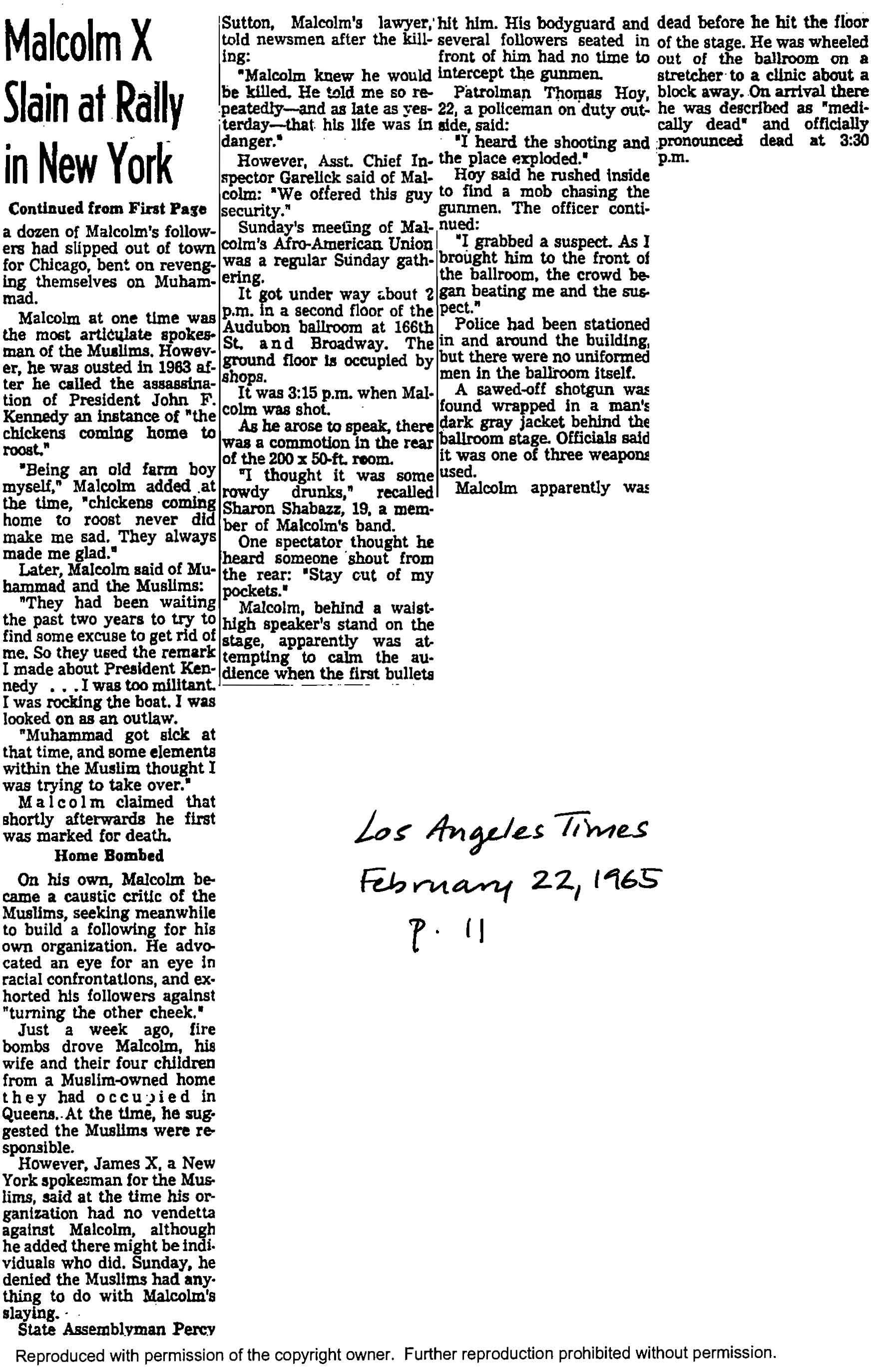“Malcolm X Gunned Down,” Los Angeles Times, February 22, 1965, p. 11.