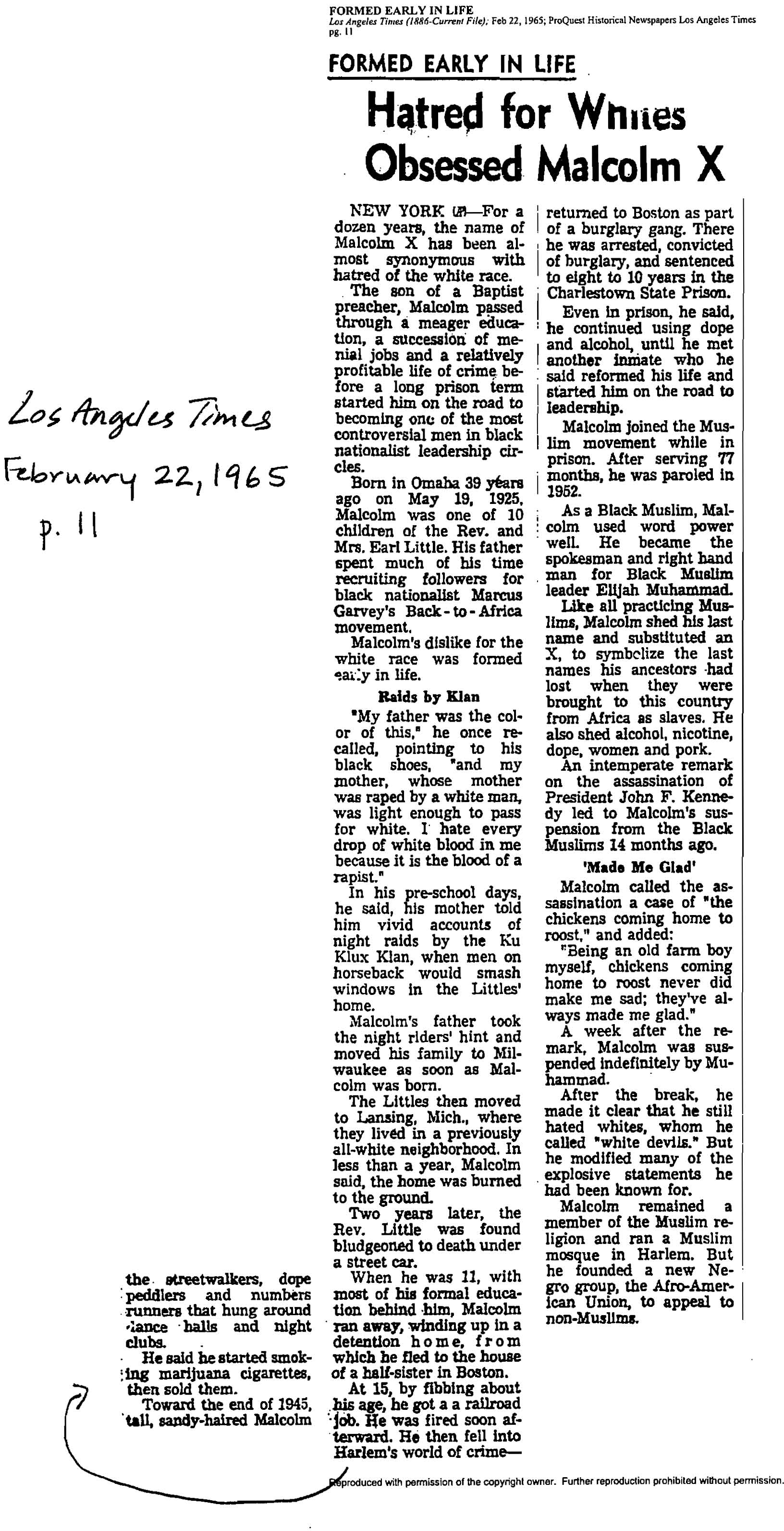 “Hatred for Whites Obsessed Malcolm X,” Los Angeles Times, February 22, 1965, p. 11.