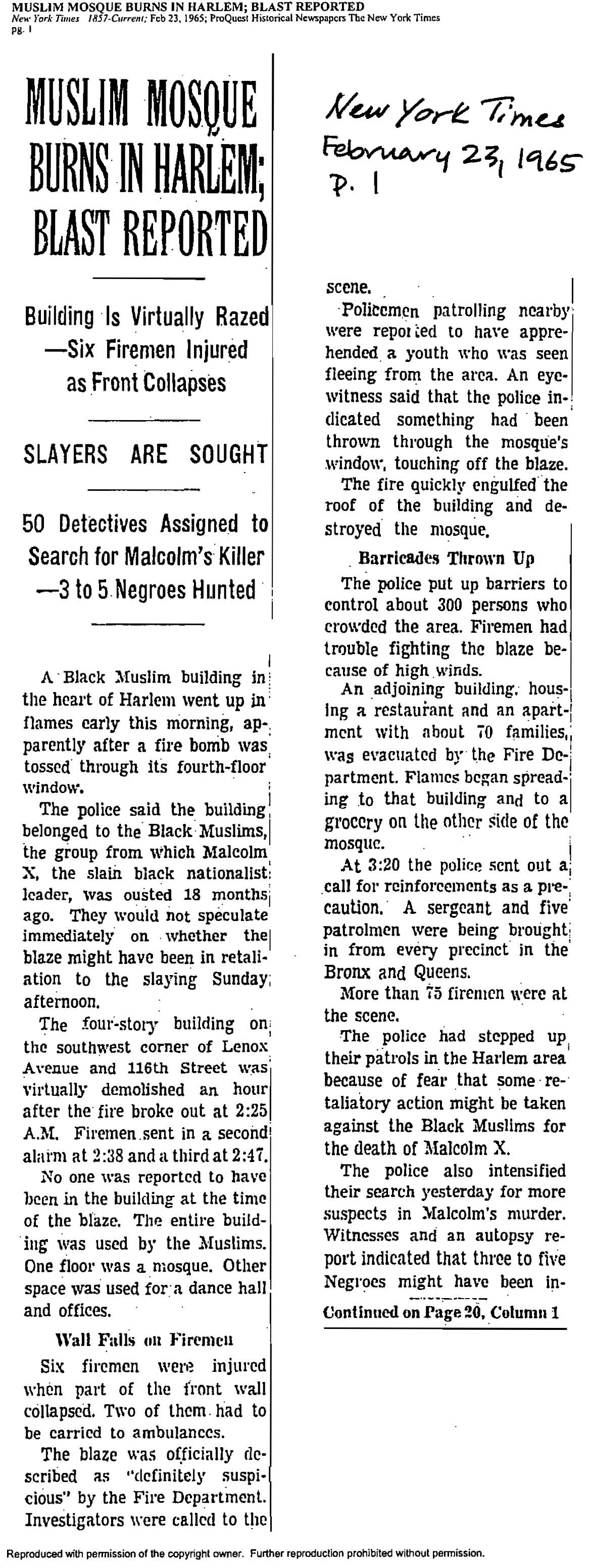 “Muslim Mosque Burns in Harlem; Blast Reported,” New York Times, February 23, 1965, pp. 1, 20.