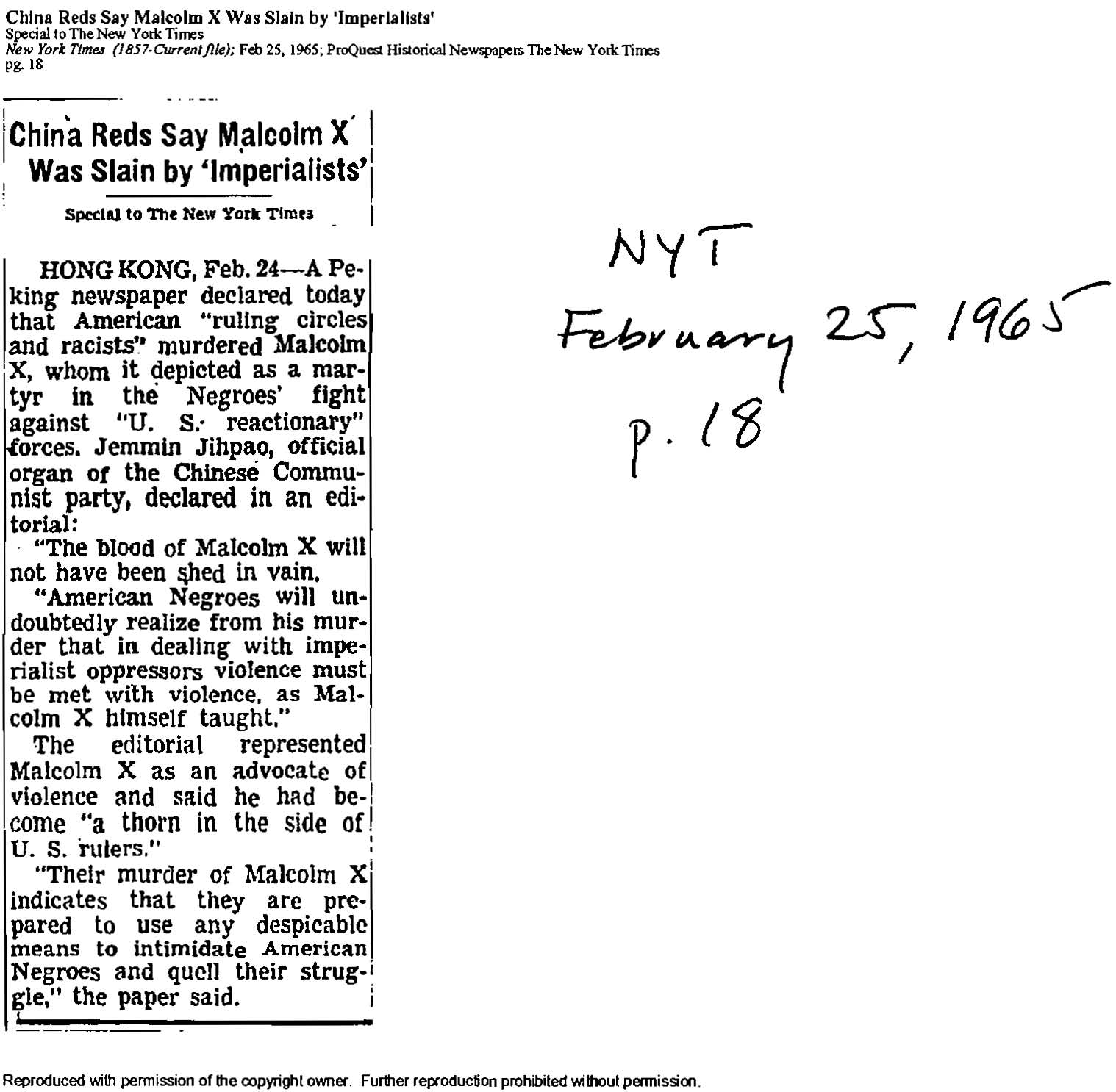 “China Reds Say Malcolm X Was Slain by ‘Imperialists’,” New York Times, February 25, 1965.