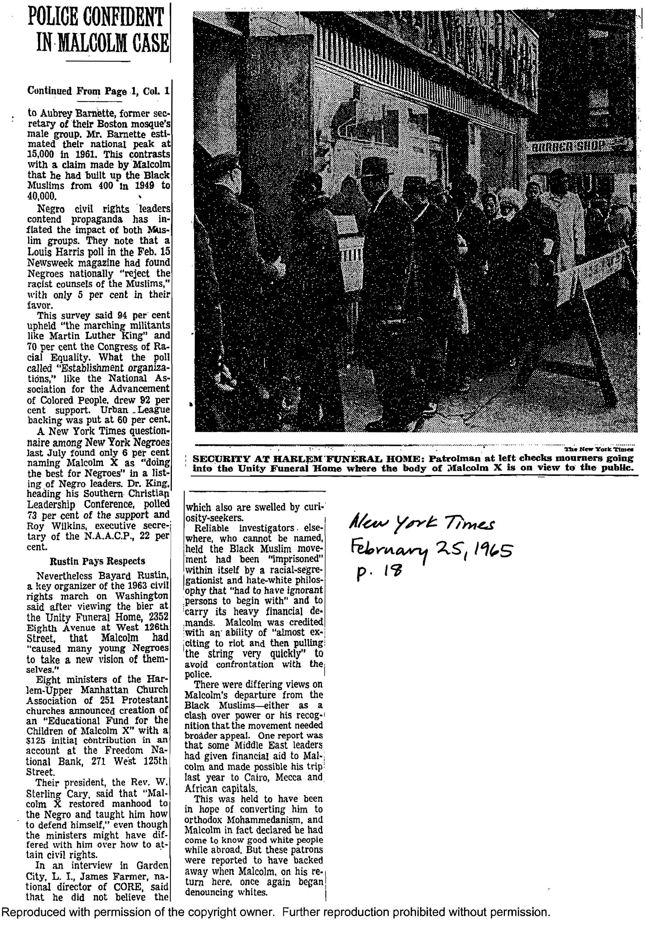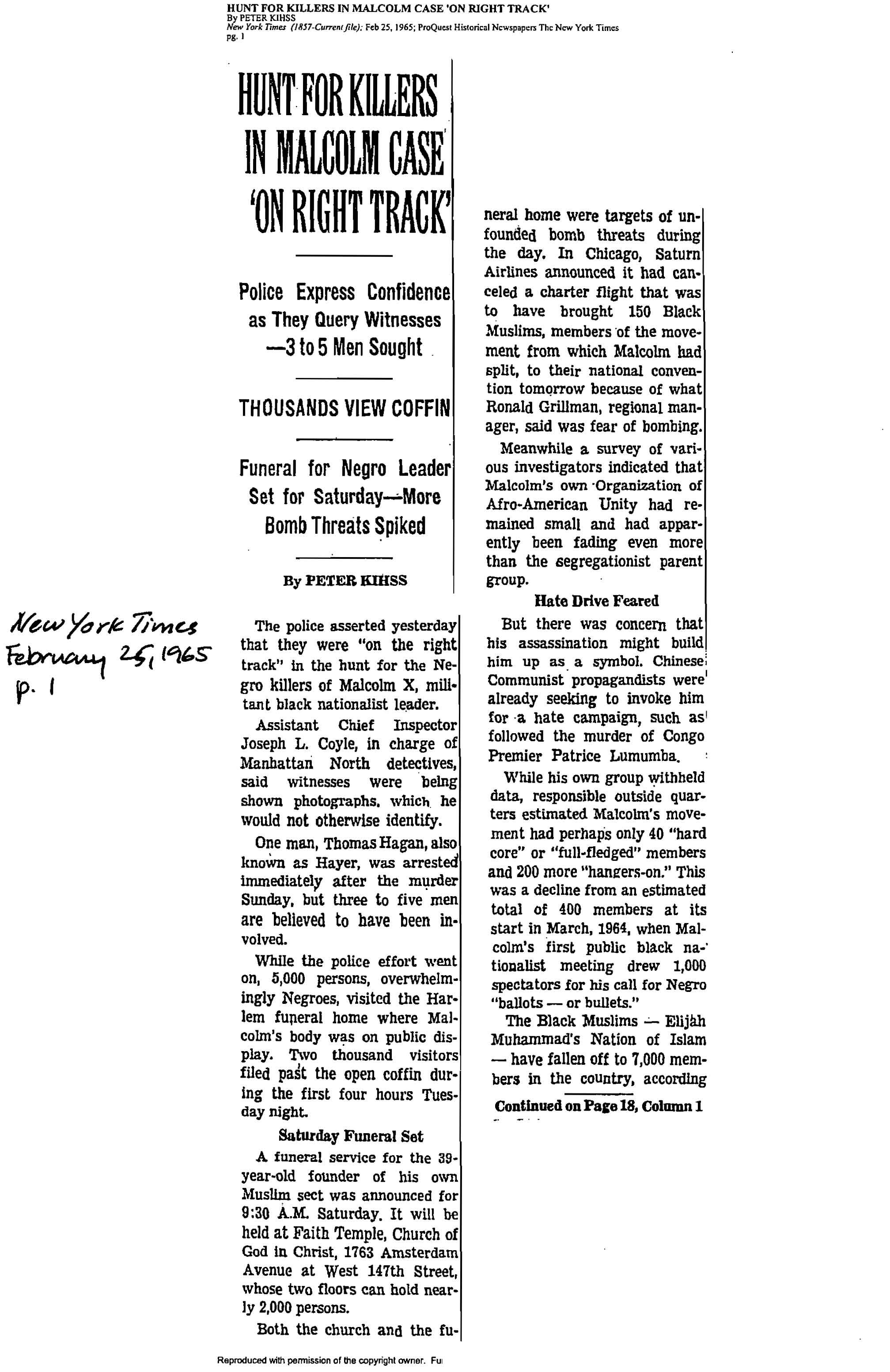 Kihiss, “Hunt for Killers in Malcolm Case ‘On Right Track’,” New York Times, February 25, 1965, pp. 1, 18.