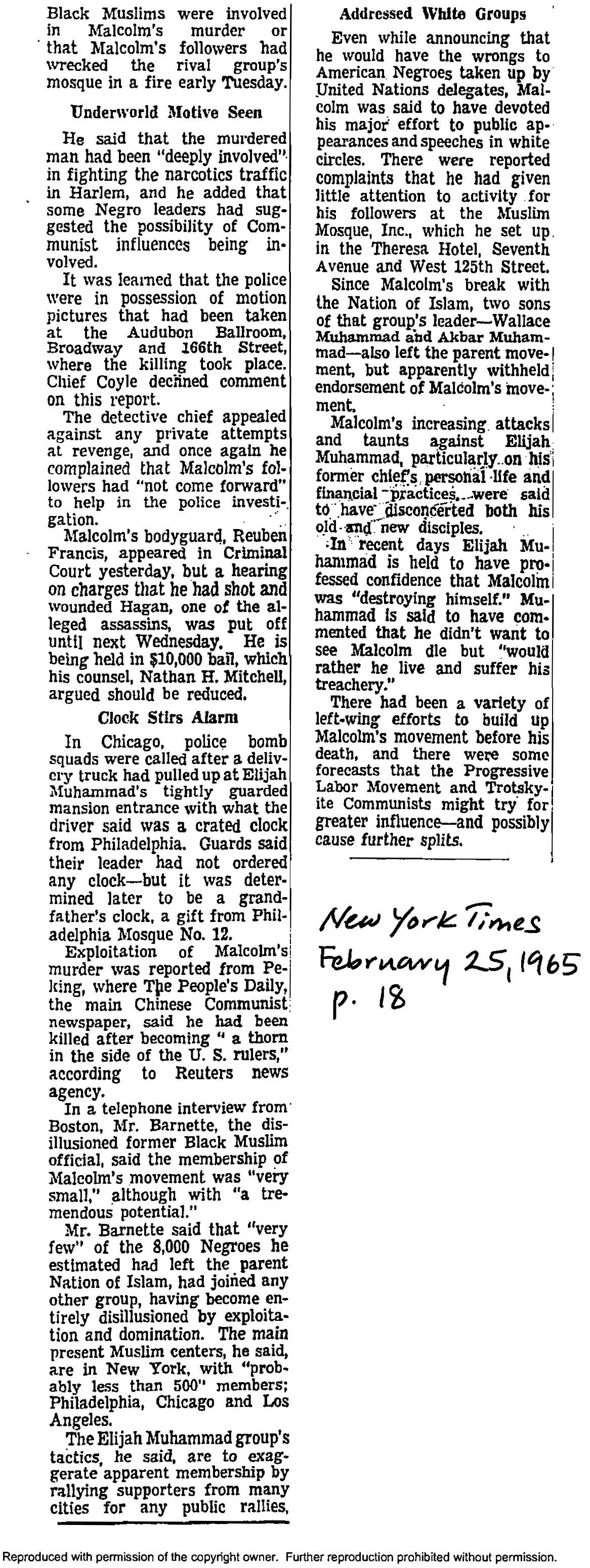 “Obituary of Malcolm X,” New York Times, February 22, 1965, p. 20.