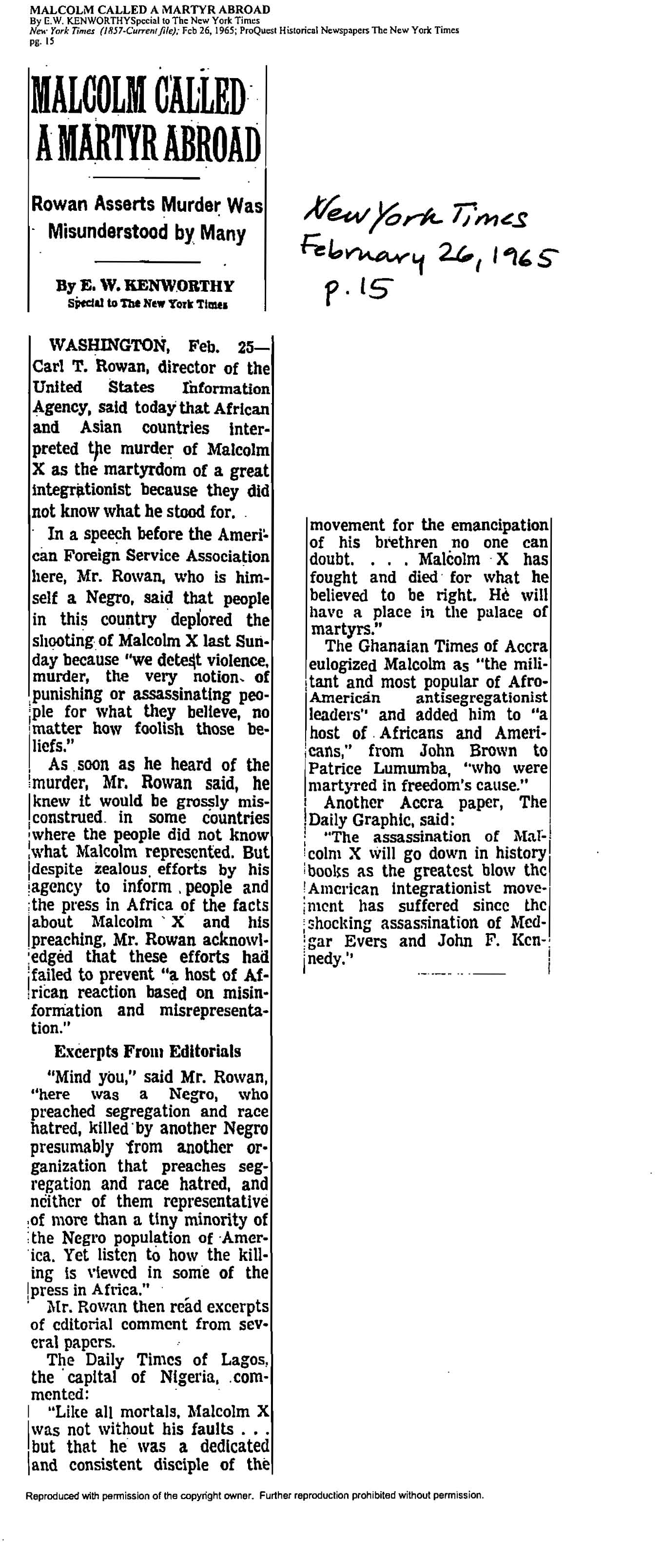 Kenworthy, “Malcolm Called a Martyr Abroad,” New York Times, February 26, 1965, p. 15.