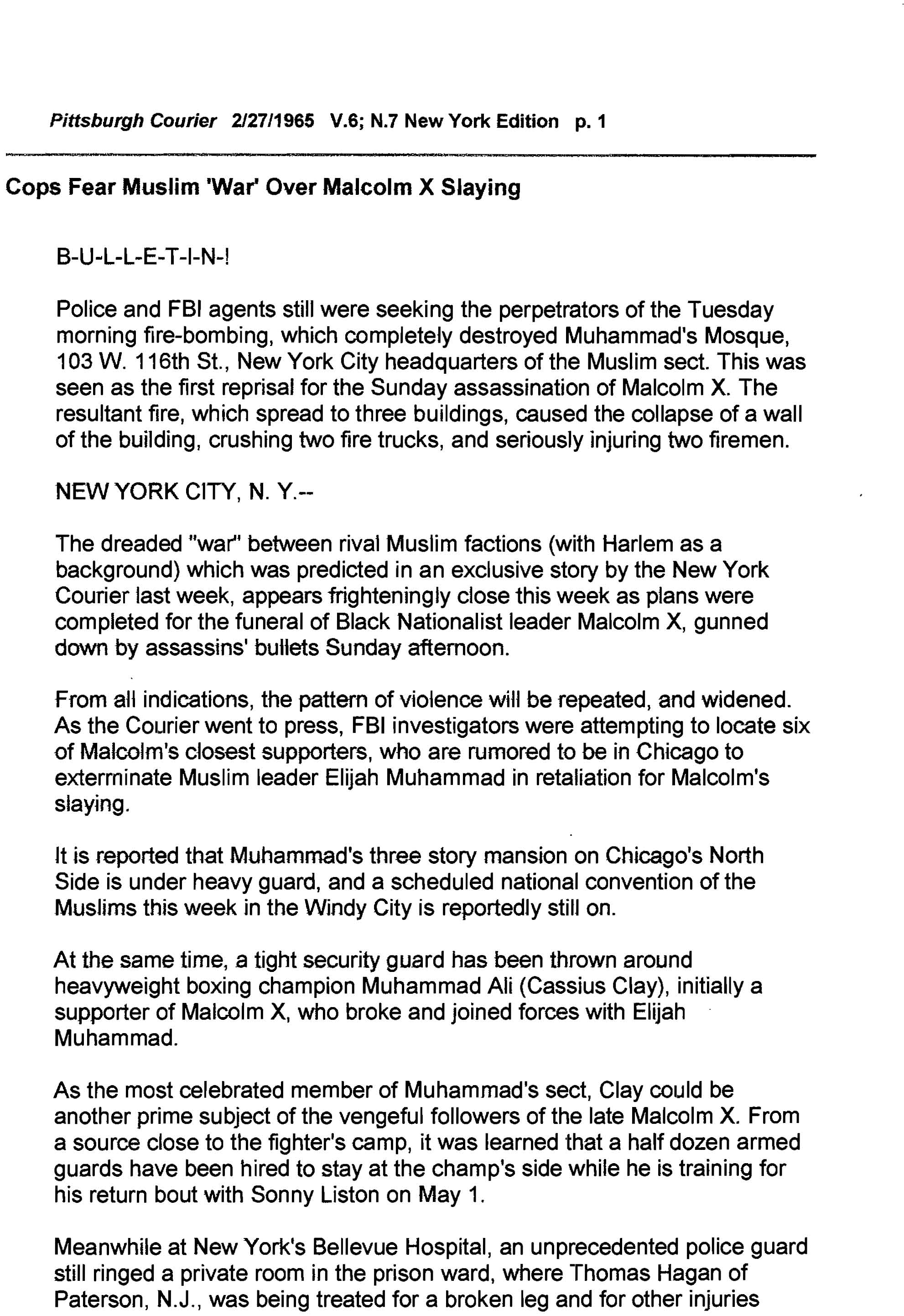 “Cops Fear Muslim ‘War’ Over Malcolm X Slaying,” Pittsburgh Courier, February 27, 1965, p. 1.