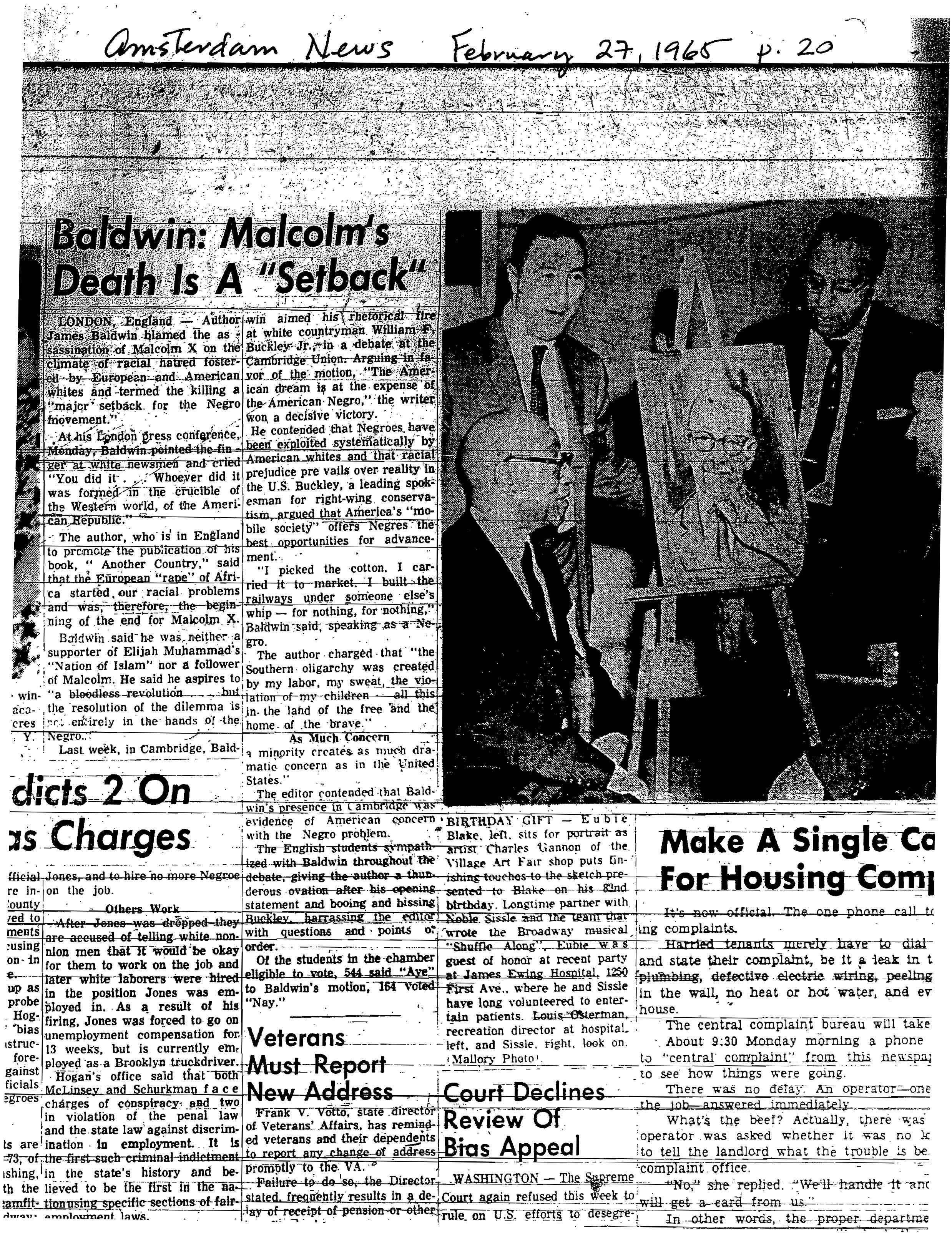 “Baldwin: Malcolm’s Death is a ‘Setback’,” Amsterdam News, February 27, 1965, p. 20.