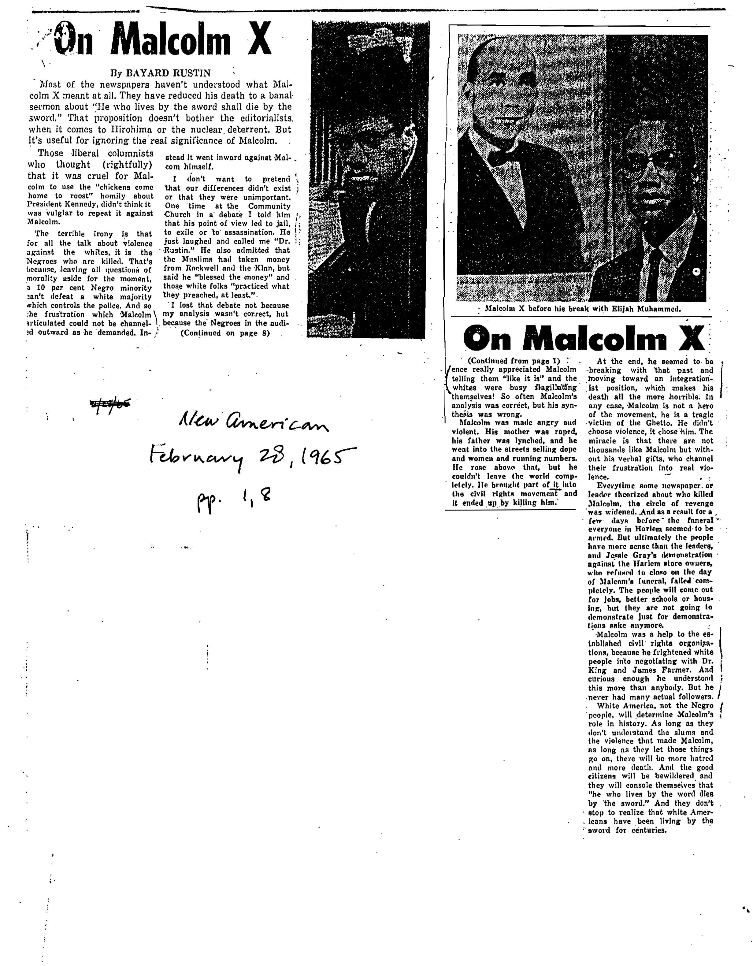 Rustin, “On Malcolm X,” New American, February 28, 1965, pp. 1, 8.