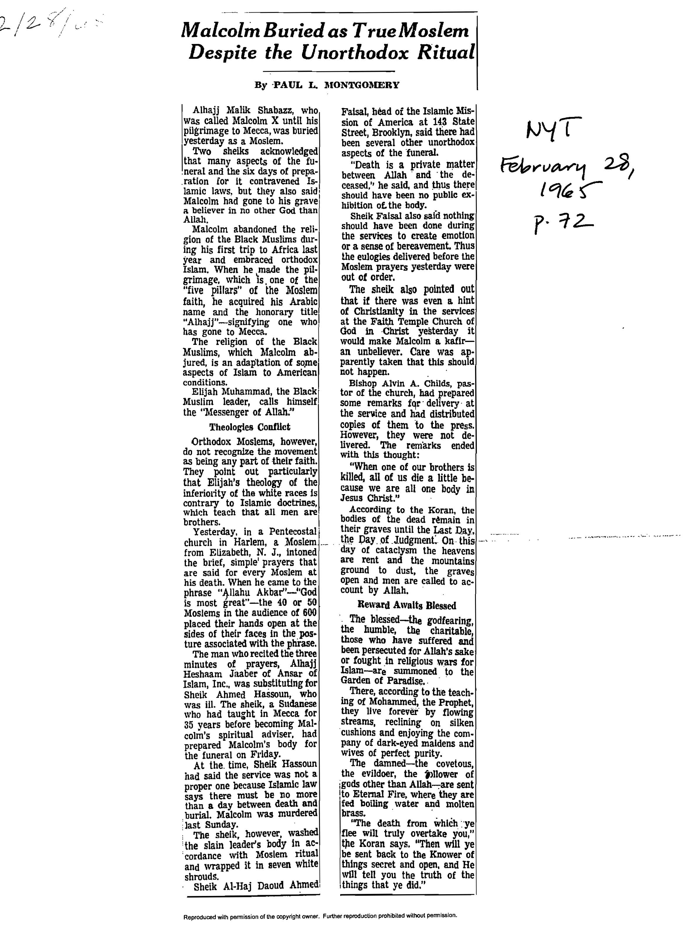Montgomery, “Malcolm Buried as True Moslem Despite the Unorthodox Ritual,” New York Times, February 28, 1965, p. 72.