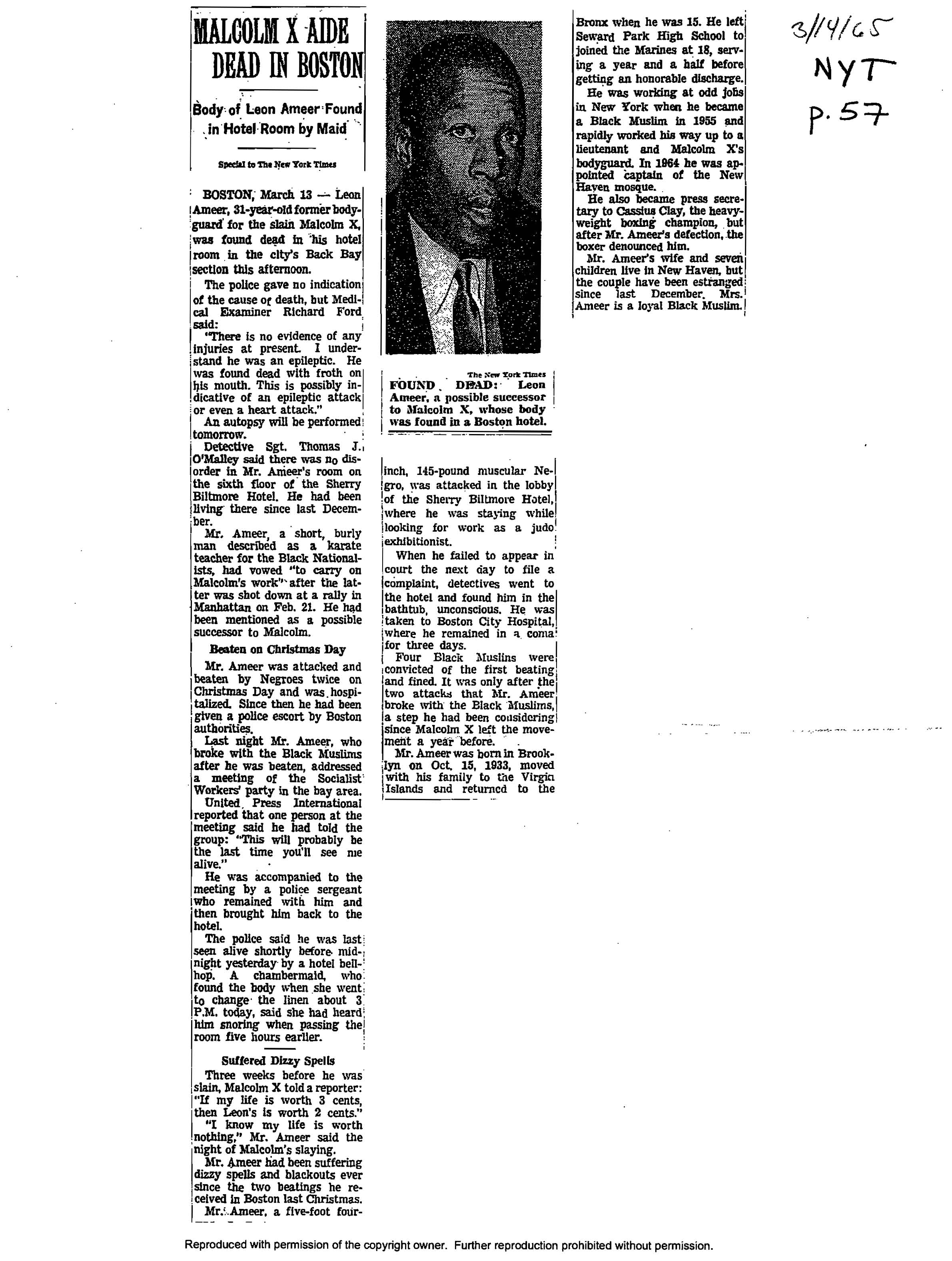 “Malcolm X Aide Dead in Boston,” New York Times, March 14, 1965, p. 57.