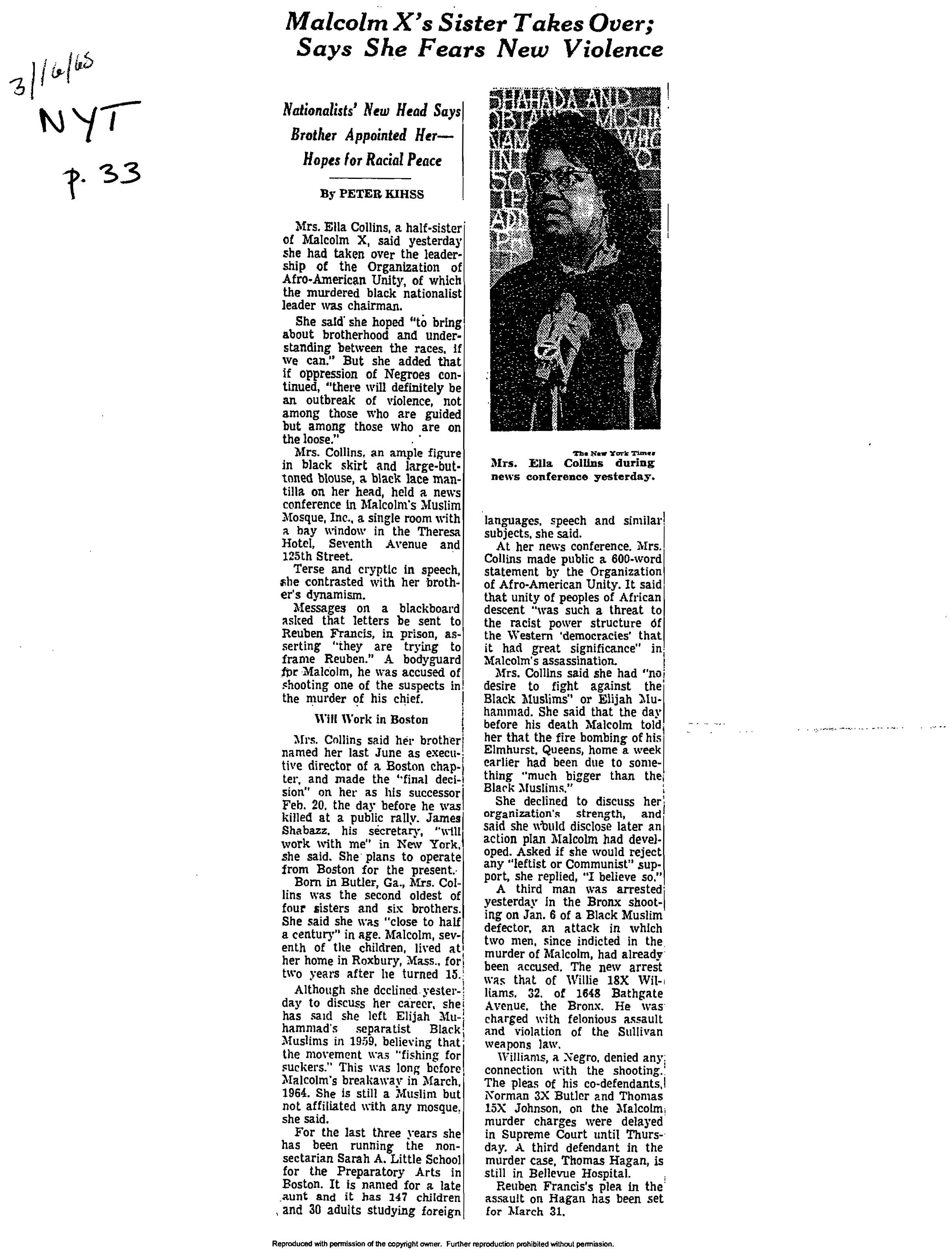 “Malcolm X’s Sister Takes Over; Says She Fears New Violence,” New York Times, March 16, 1965, p. 33.