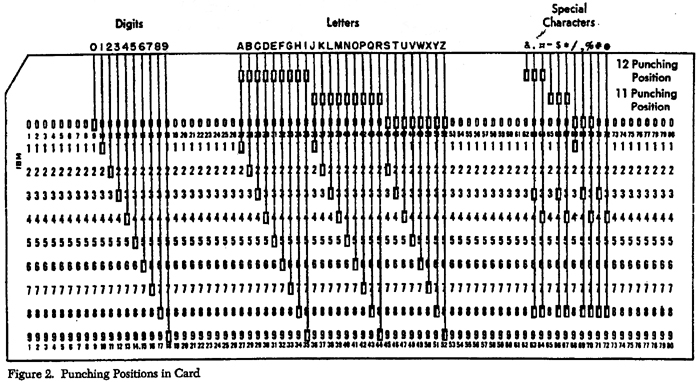 Note that the punched-card code is duodecimal (base 12), and is therefore different from the computer's internal code, which was usually decimal or binary. The character set -- i.e. the repertoire of characters, regardless of how they are coded -- in this case is Binary Coded Decimal Interchange Code, or BCDIC, a 48-character code. BCDIC and its card code descend directly from the original design of Herman Hollerith. As you can see, the symbols are designed primarily for accounting and statistics, and are not sufficient for programming languages such as Fortran. BCDIC includes the 26 uppercase Roman letters, the 10 digits 0-9, and 11 special characters: Ampersand (&), Period (.), Lozenge (◊), Minus sign (-), Dollar sign ($), Asterisk (*), Slash (/), Comma (,), Percent sign (%), Number sign (#), and Commercial At Sign (@). Later versions of BCDIC (and 026 key punch models, interpreters, etc) allowed for programming by replacing some of the special characters by Plus Sign, Parentheses, and so on.