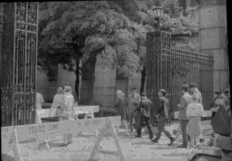 Columbia University 1968. Guard checking IDs at main gate, 116th Street and Broadway.