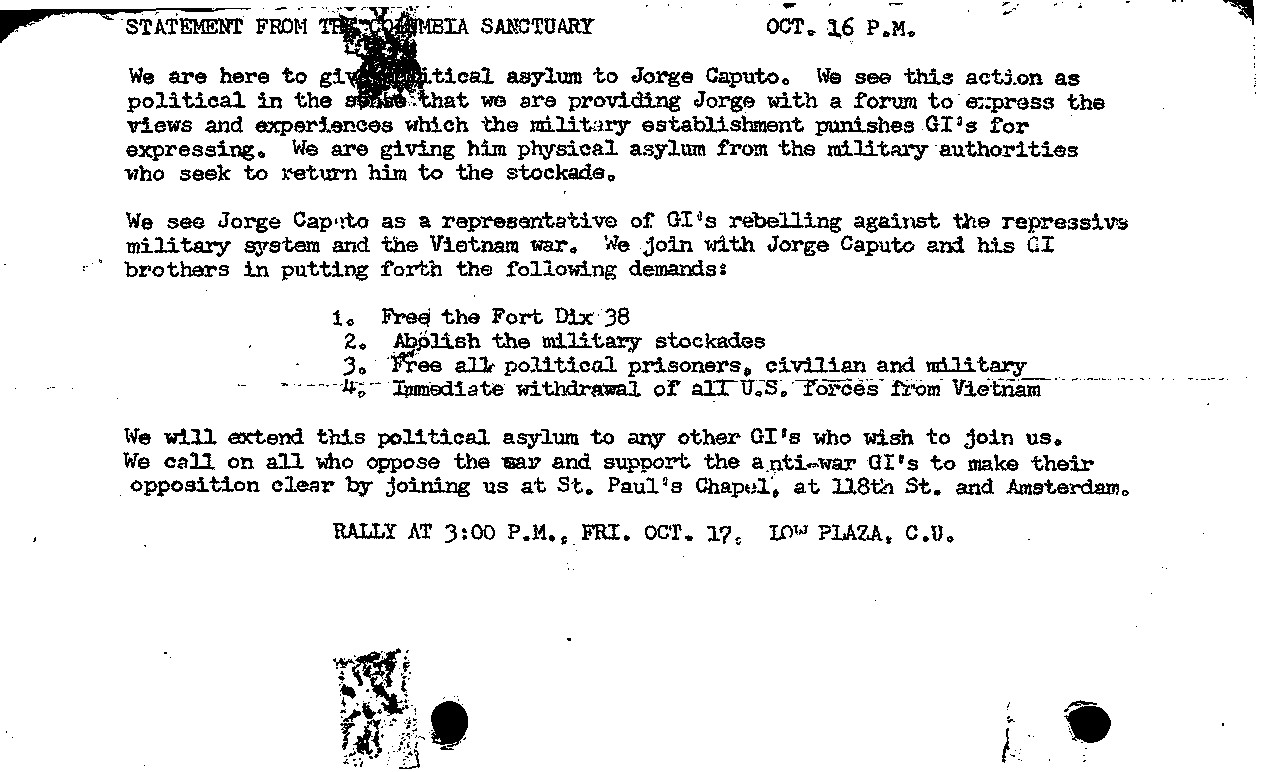 Columbia University, Jorge Caputo / Fort Dix leaflet, October 1969.