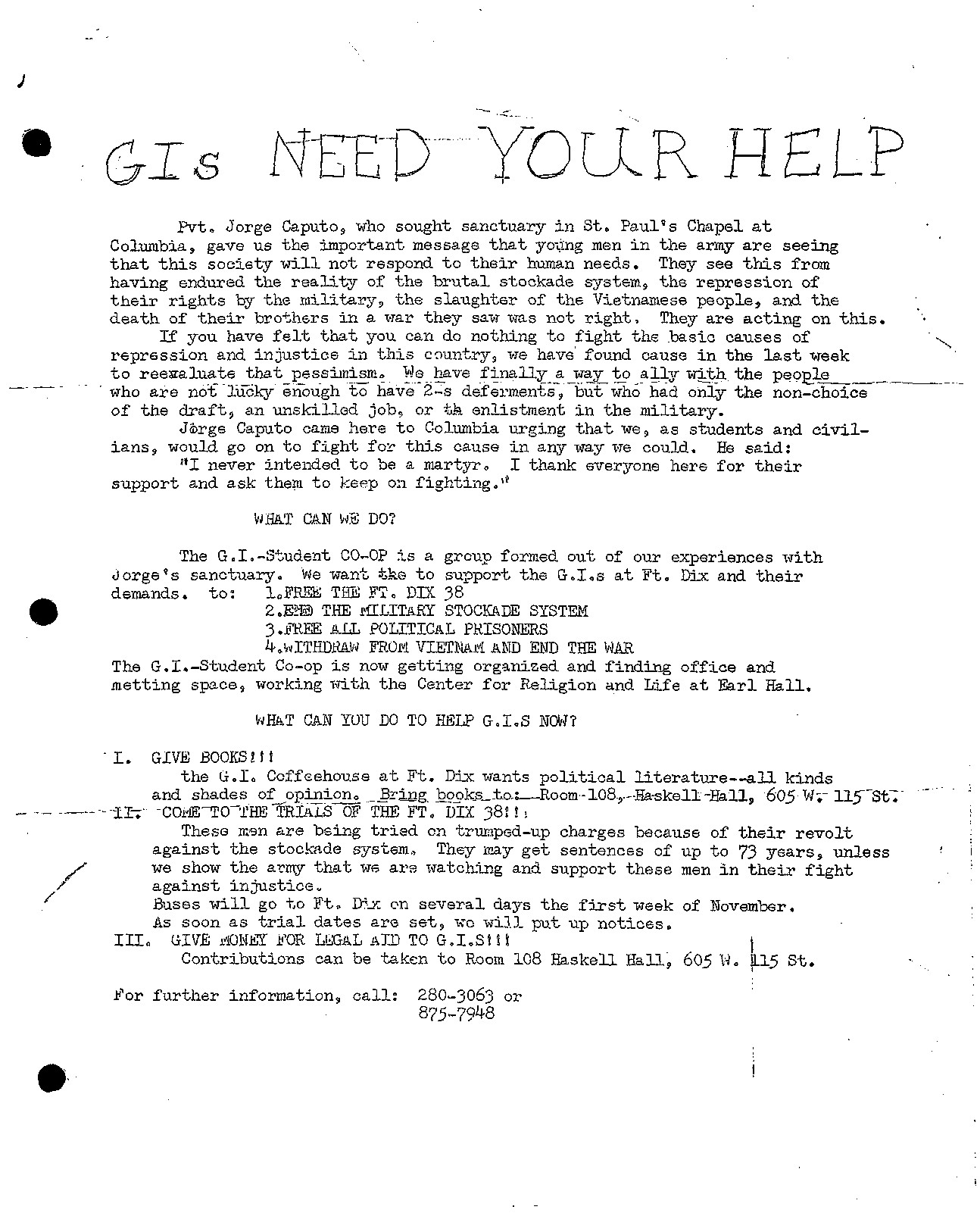 Columbia University, Jorge Caputo / Fort Dix leaflet, October 1969.