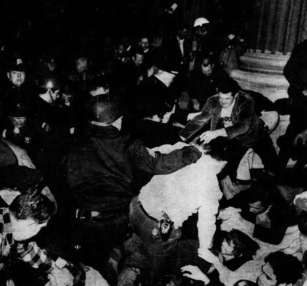 "Cops Smash Campus Sit-In ... Rout Rebels in Sharp Battle ... The Lion Tamers Move In at Columbia: Helmeted police scuffle with students sitting on the steps of Columbia University's Low Library early this morning as the students try to block cops' entrance. Hundreds of police, including members of the Tactical Patrol Force, were bused to the beleaguered campus to smash the week-long sit-in in five buildings. When the rebel students ignored police pleas to come out of the buildings, police were ordered in. Violence and arrests resulted." —New York Daily News, Tuesday, April 30, 1968, Page 1.