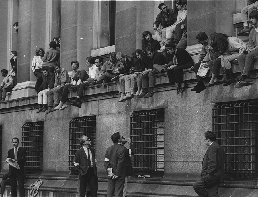 Low Library, west ledge, early in the occupation we had some friendly faculty (white armbands) below us in case we were attacked by unfriendlies.