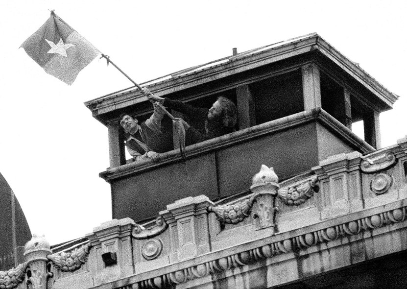 Waving a Viet Cong flag from the cupola atop of the Math building. I'm not sure but the guy on the right could be Melvin Margulis.