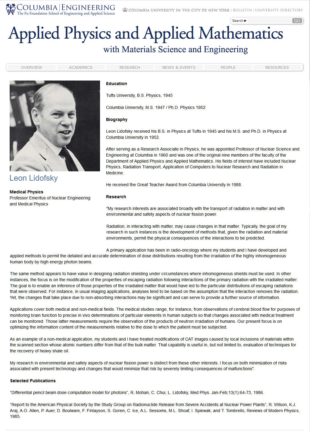 Screenshot from the Google cache of a Columbia University Engineering school page that disappeared in August 2016 after he died on September 6th of that year. Click to enlarge.