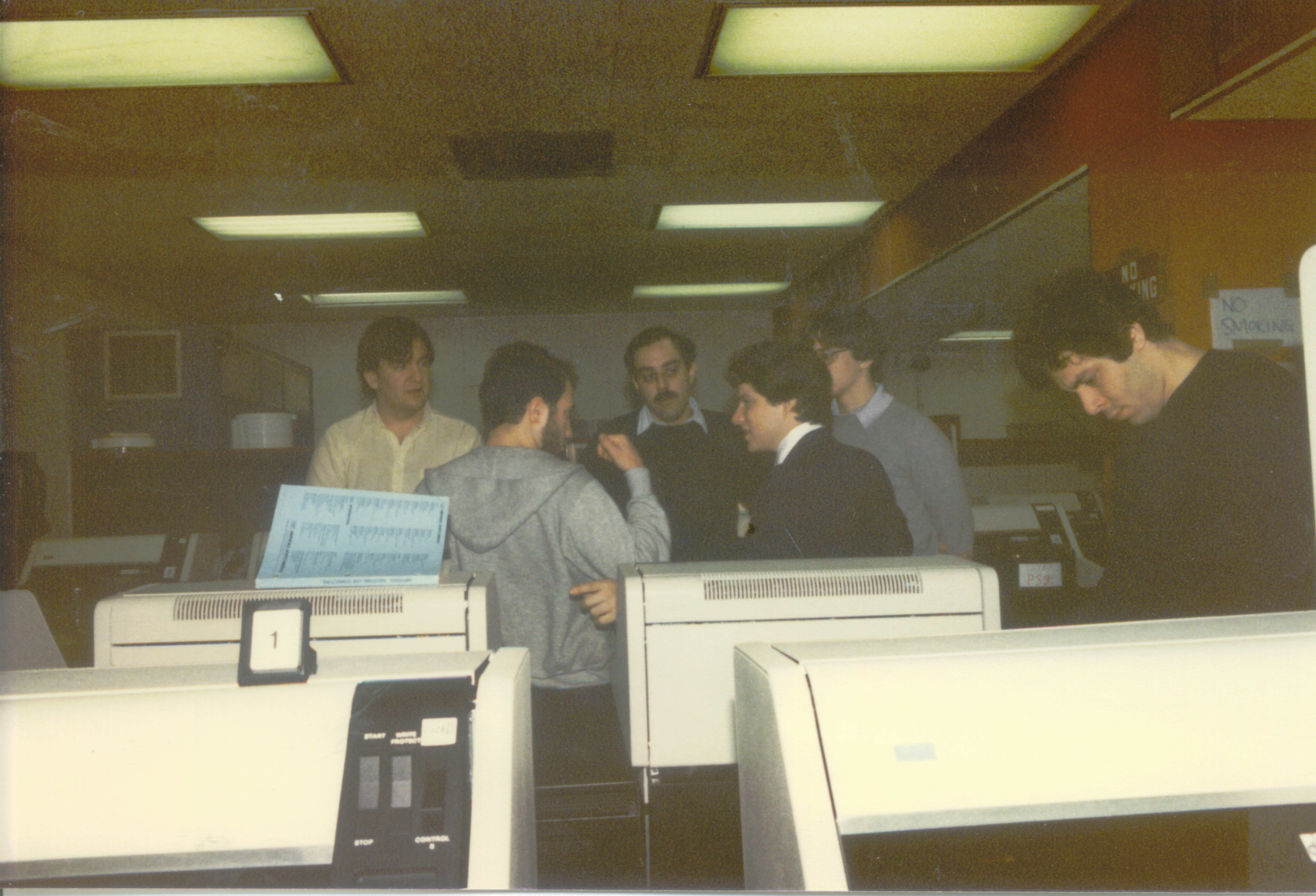 The people in the photo, from left to right are: Ken Rossman, Eric Weaver, Vace Kundakci (now Director of AcIS), Thomas DeBellis (me!), Andrew Kosoresow (a part time systems programmer who worked for me) and Phil Cokorinos, the head of SA (Systems Assurrance, a.k.a. Data Communications). Remember that this was in 1984, so there was no HSC50, CI nor RA81 disk arrays.