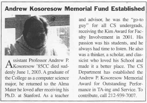 Andrew Kosoresow went on to get two PhDs and join Columbia's CS faculty. He died June 1st, 2003. From Columbia University Engineering News, Fall 2003: