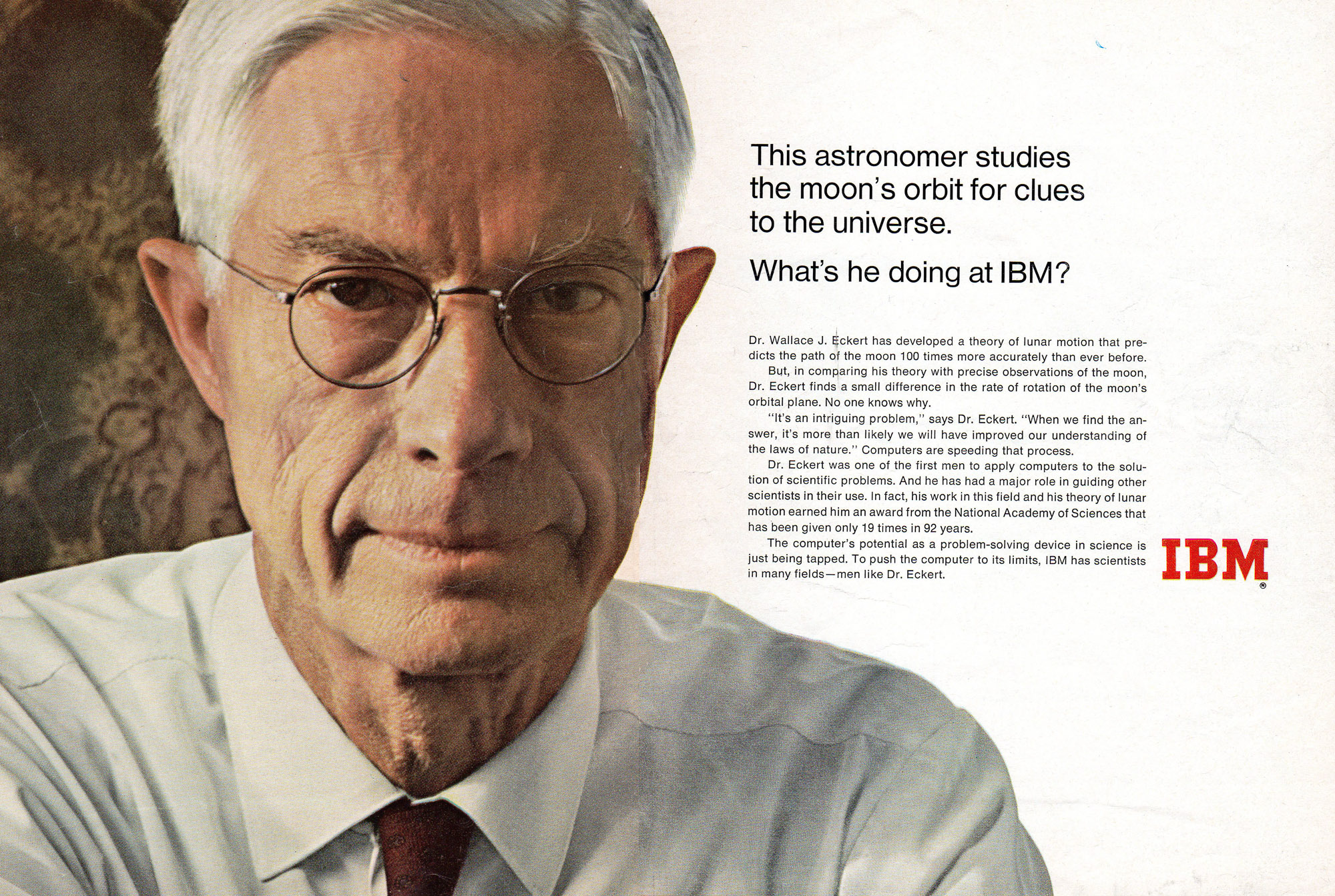 An IBM magazine or newspaper advertisement from the late 1960s or early 1970s featuring Wallace Eckert.