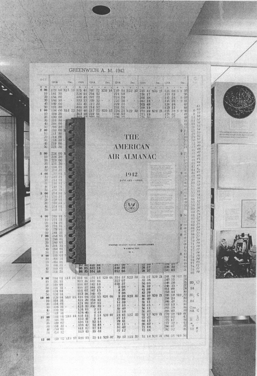 The 1942 issue of the American Air Almanac, produced quarterly by Eckert 1940-45 during his tenure as director of the Nautical Almanac Office of the US Naval Observatory. Eckert's almanacs were the basis for US air and sea navigation in World War II, and were produced entirely "by computer" using methods devised by Eckert at Columbia and USNO. In the background, an enlarged computer-printed almanac page showing how Eckert was able to coerce the primitive early printers into producing high-quality compact and readable tables. (More about this HERE.)