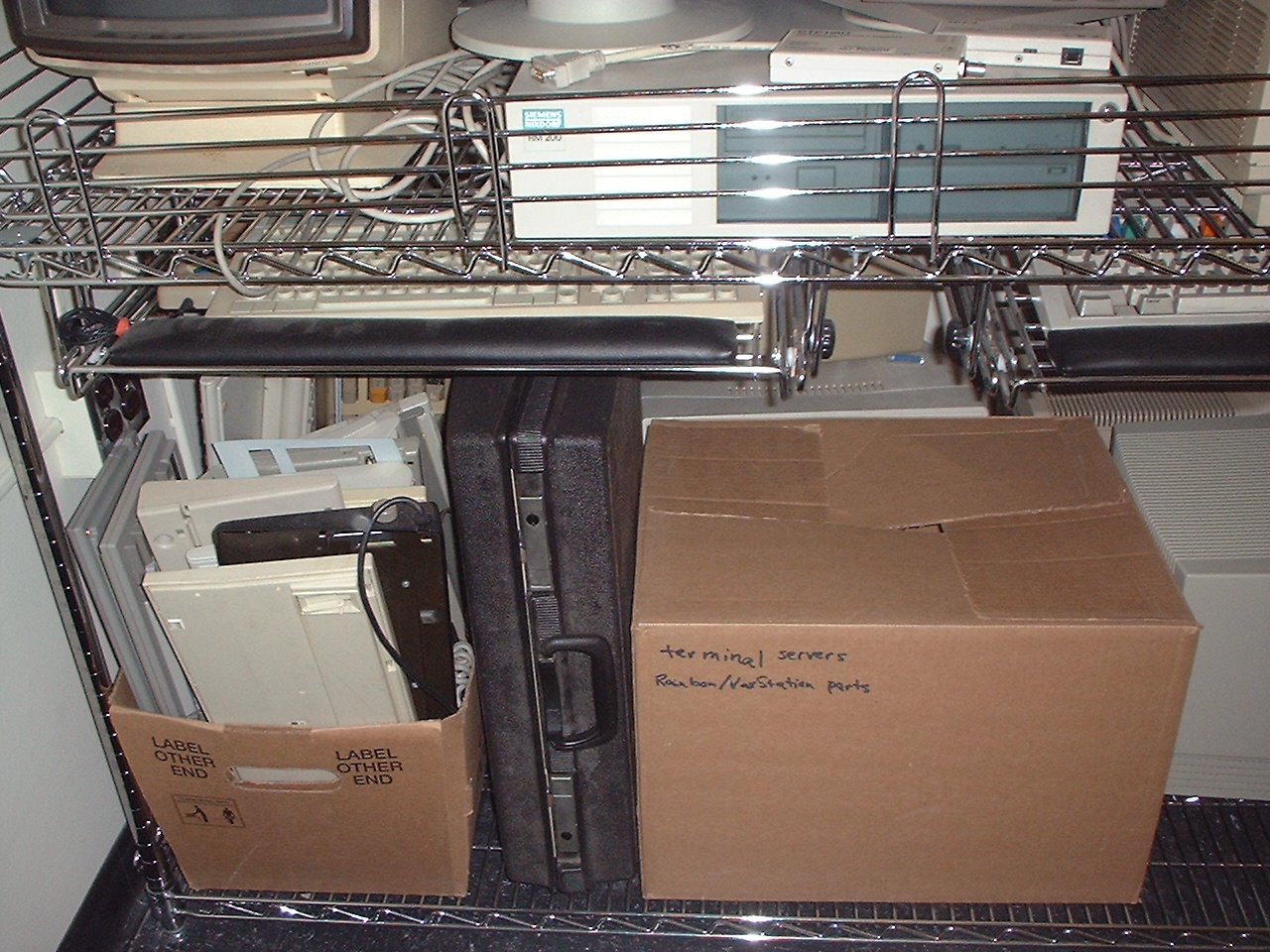Bottom shelf. Big box of keyboards; Digital Equipment Corporation GiGi,