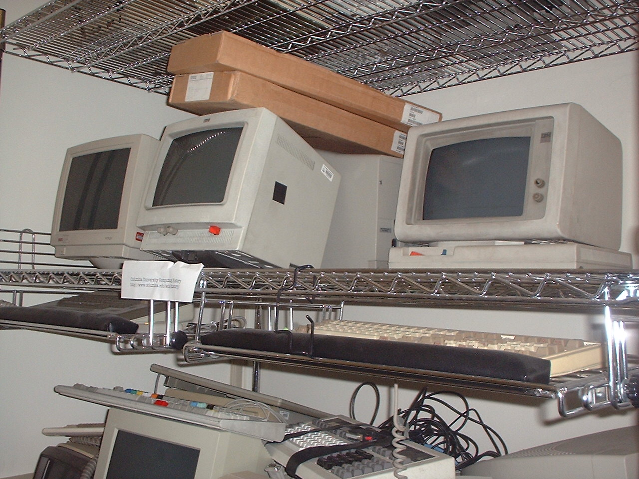 Oblique view, closeup of middle shelf. I think the one on the right is an IBM 3031. On top are some keyboards in their boxes, lots more keyboards below.