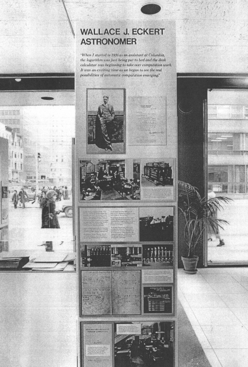 These are scans of xerographic copies of 8x10" glossy photographs from a special exhibit at the Smithsonian Institute commemorating the life and work of Wallace Eckert, 1973, courtesy of the Smithsonian Institution Archives. The exhibit was created by Henry S. Tropp, Principal Investigator of the Smithsonian's Computer History Project, mainly from materials loaned by Mrs. Eckert.